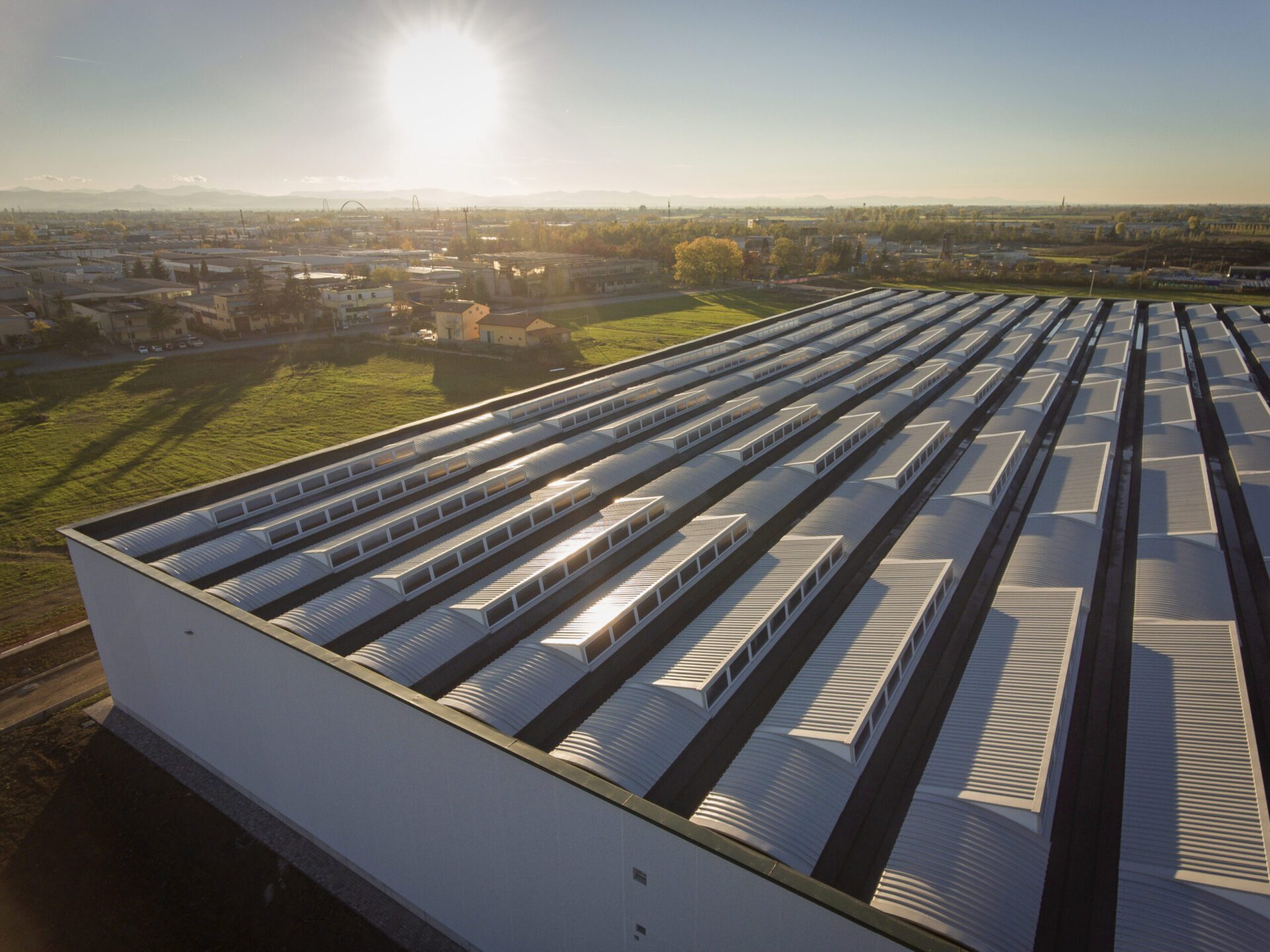La copertura a shed è caratterizzata da falde intervallate da finestrature verticali, soluzione ottimale per l’installazione di pannelli fotovoltaici che migliora l’efficienza energetica dell’edificio. La disposizione delle falde e delle finestre permette alla luce naturale di entrare nell’edificio in modo diffuso e uniforme, riducendo la necessità di illuminazione artificiale.